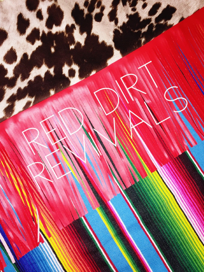 Handmade cow print top panel shower curtain with red fringe and turquoise serape bottom panel! (Shower curtains are an original handmade item by Red Dirt Revivals. We are currently in the process of shortening our turnaround time and building our inventory. Please allow time for your items to be made. If you have any questions please feel free to email or send a message on Facebook! Thank you so much. -Megan)